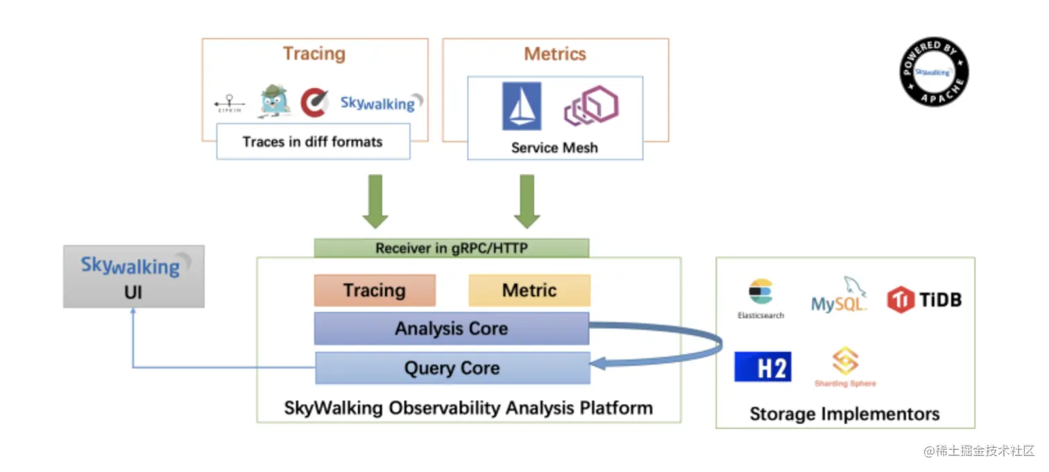 Elasticsearch、MySQL数据库、H2数据库等。同时OAP还使用查询引擎(Query Core)提供HTTP查询接口。 - Skywalking提供单独的UI进行数据的查看,此时UI会调用OAP提供的接口,获取对应的数据然后进行展示。