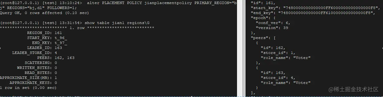 注意:虽然 placement policy 高级匹配规则的默认 followers 是 2(三副本)但是实际的副本数还是要看符合 lable 的 tikv 的数量,如果实际的tikv节点数量无法满足2followers 那么最终也只会有两个副本(也就是只有一个followers和一个leader)上边的查询结果可以看到实际 region 的副本只有两个,但是当查询 localtion_policy 这个规则定义的时候 followers 为 2