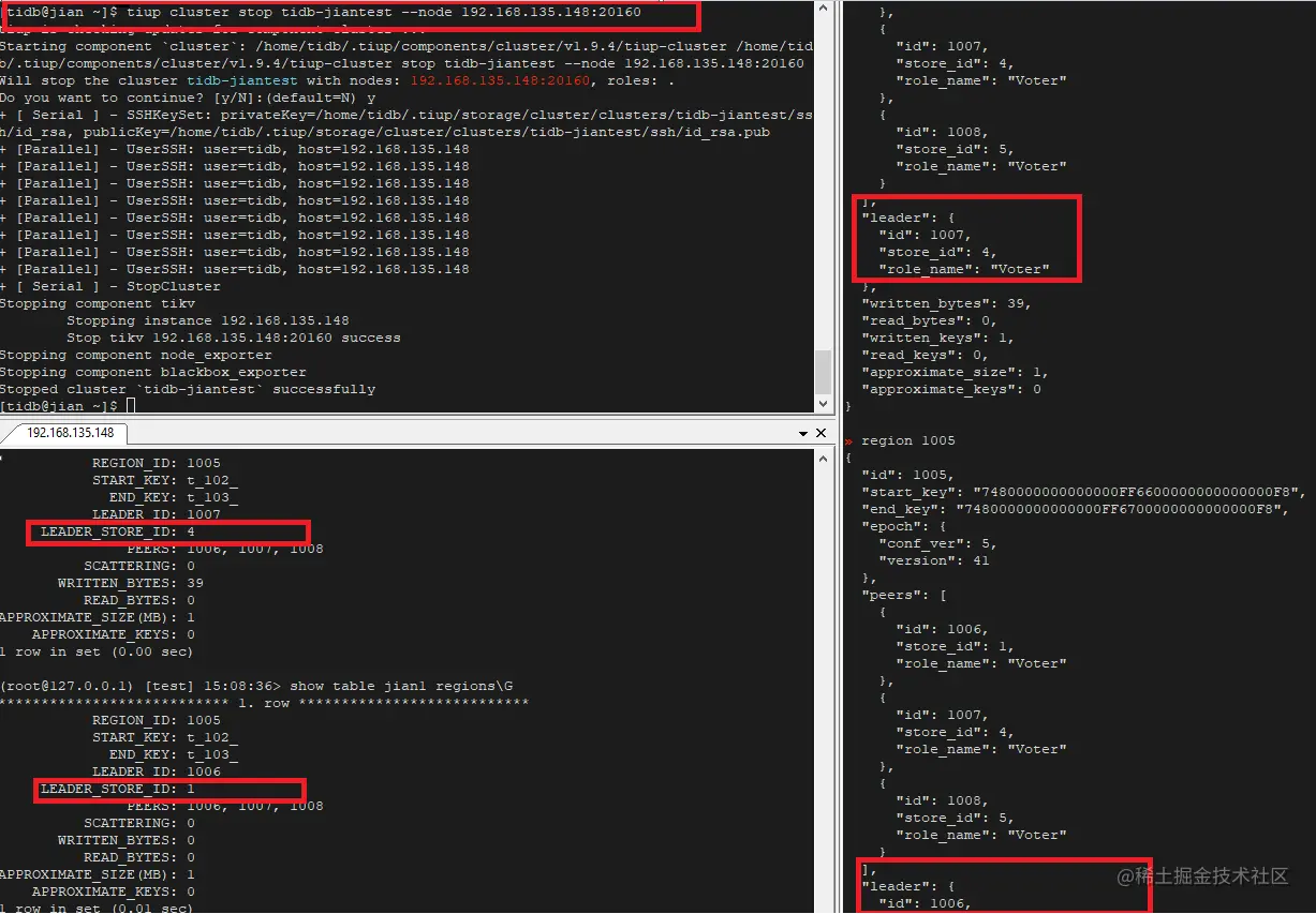 leader 节点:store4-- 停止 store 的 tikv ---》store1 -- 恢复 tikv 节点-- 》store4