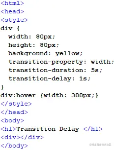 在这个例子中,我们将使用延迟属性,用样式标签的方法对一个div元素进行宽度转换。过渡-延迟属性将应用于一个div,过渡将在该div的宽度上发生。