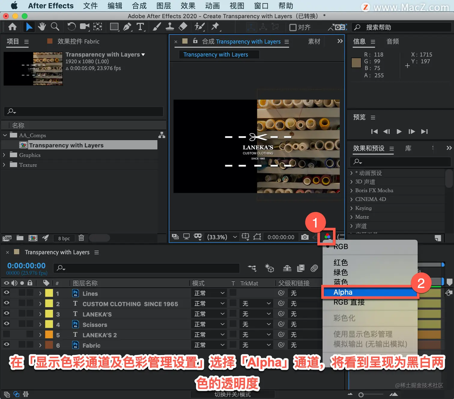 在「显示色彩通道及色彩管理设置」选择「Alpha」通道,将看到呈现为黑白两色的透明度。100% 白色即表示 100% 不透明,100% 黑色即表示 100% 透明。
