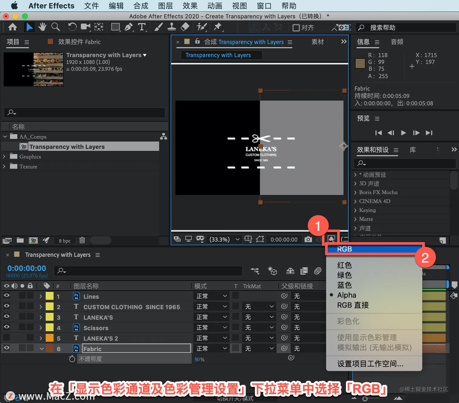 继续构建项目,在「显示色彩通道及色彩管理设置」下拉菜单中选择「RGB」。
