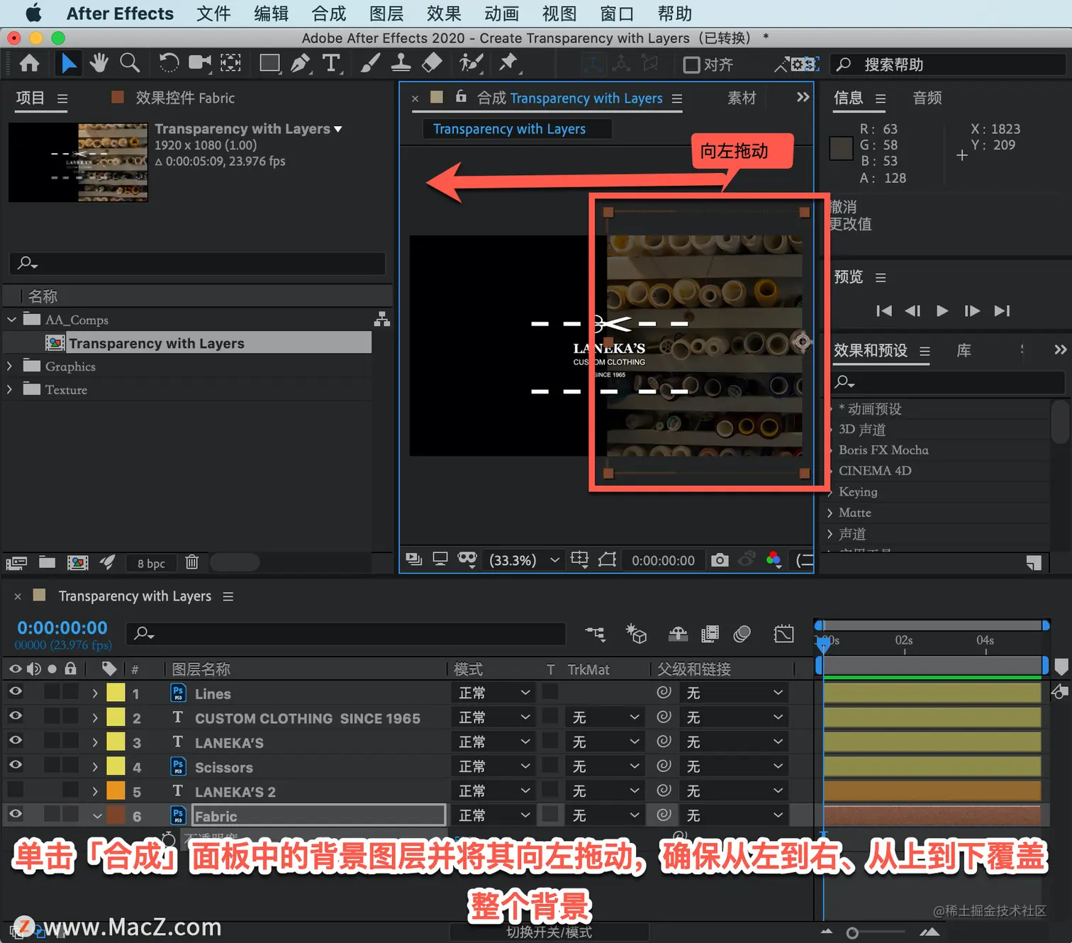单击「合成」面板中的背景图层并将其向左拖动,确保从左到右、从上到下覆盖整个背景。