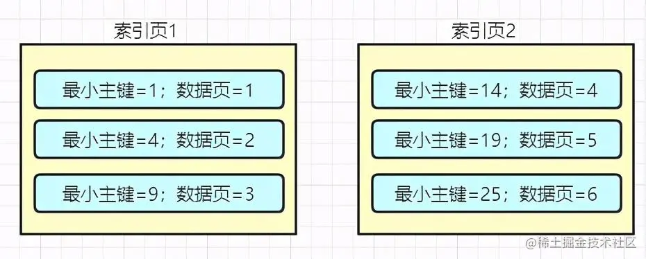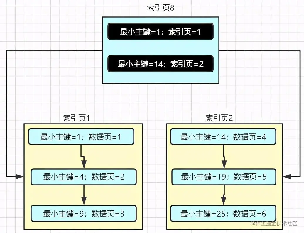 没错,MySQL 也是这么设计的,也就是说 MySQL 同时也设计出了用于维护索引页的数据结构,其实也还叫索引页,只不过他们是在不同的层级,类似下面这样子的: