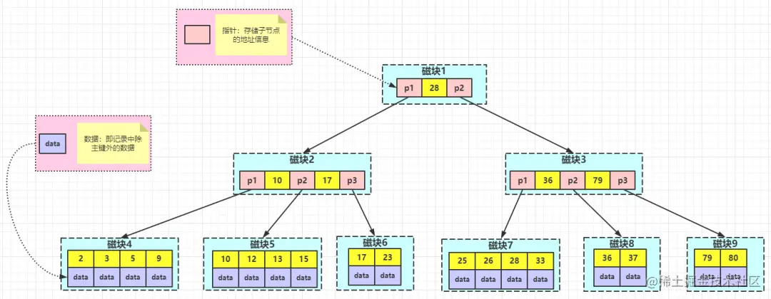从B树的结构图中可以看到每个节点中不仅包含数据的 key 值,还有 data 值。