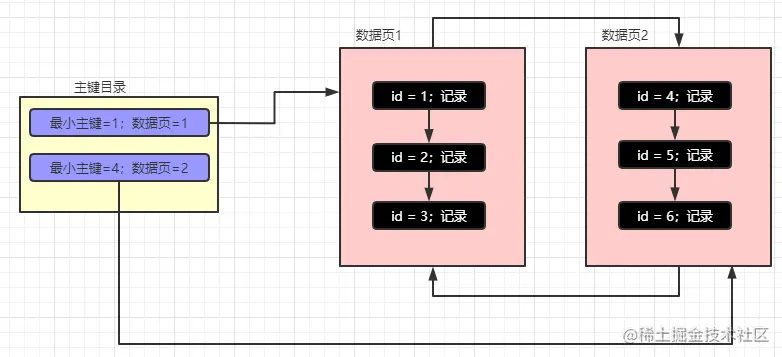 索引页中记录的是每页数据页的页号和该数据页中最小的主键的记录,也就是说最小主键和数据页号不是单纯的维护在主键目录中了,而是演变成了索引页,索引页和数据页类似,一张不够存就分裂到下一张。