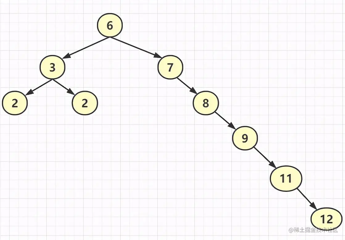 但是在极端情况下会出现链化的情况,即节点一直在某一边增加。如下图