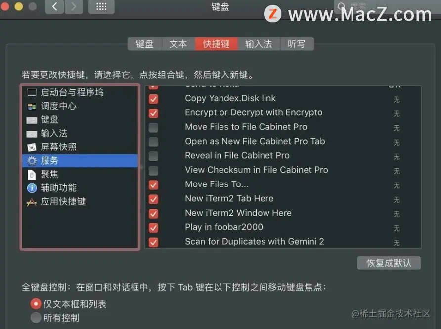 4、左边列表里选择“服务”选项,右边服务列表里,去掉用不到的选项的勾选即可完成。
