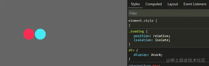 需要注意的是在容器中加上 isolation 属性,这样混合效果会只作用到容器中的元素,否则的话页面的背景颜色都会加入混合计算中去。如图: