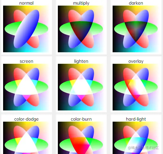 改变重叠部分的颜色可以使用CSS 的混合模式 mix-blend-mode。