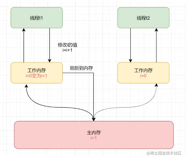 首先,执行线程t1从主内存中读取到i=0,到工作内存。然后在工作内存中,赋值i+1,工作内存就得到i=1,最后把结果写回主内存。因此,如果是单线程的话,该语句执行是没问题的。但是呢,线程t2的本地工作内存还没过期,那么它读到的数据就是脏数据了。如图: