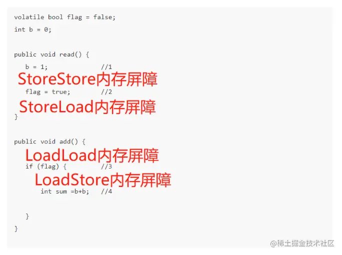 有些小伙伴,可能对这个还是有点疑惑,内存屏障这玩意太抽象了。我们照着代码看下吧(LoadLoad内存屏障也是在flag后面哈,图片有误)