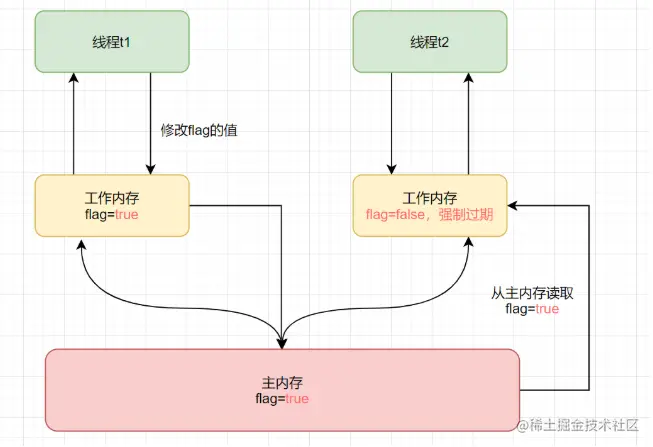 细心的朋友会发现,线程t2不还是flag旧的值吗,这不还有问题嘛?其实volatile还有一个保证,就是每次使用前立即先从主内存刷新最新的值,线程t1修改完后,线程t2的变量副本会过期了,如图:
