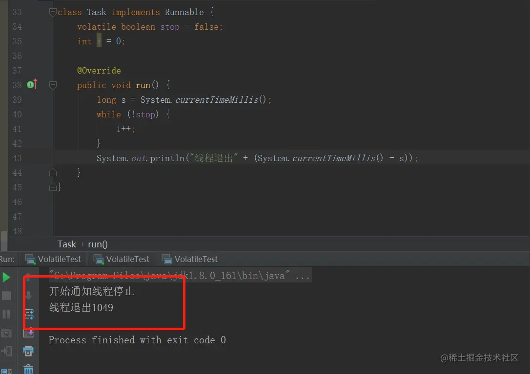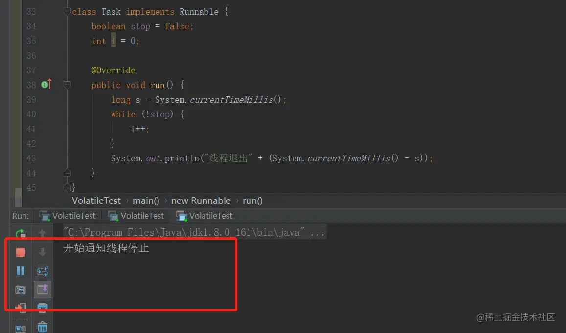 /** * @Author 捡田螺的小男孩 * @Date 2020/08/02 * @Desc volatile的可见性探索 */public class VolatileTest { public static void main(String[] args) throws InterruptedException { Task task = new Task(); Thread t1 = new Thread(task, "线程t1"); Thread t2 = new Thread(new Runnable() { @Override public void run() { try { Thread.sleep(1000); System.out.println("开始通知线程停止"); task.stop = true; //修改stop变量值。 } catch (InterruptedException e) { e.printStackTrace(); } } }, "线程t2"); t1.start(); //开启线程t1 t2.start(); //开启线程t2 Thread.sleep(1000); }}class Task implements Runnable { boolean stop = false; int i = 0; @Override public void run() { long s = System.currentTimeMillis(); while (!stop) { i++; } System.out.println("线程退出" + (System.currentTimeMillis() - s)); }}