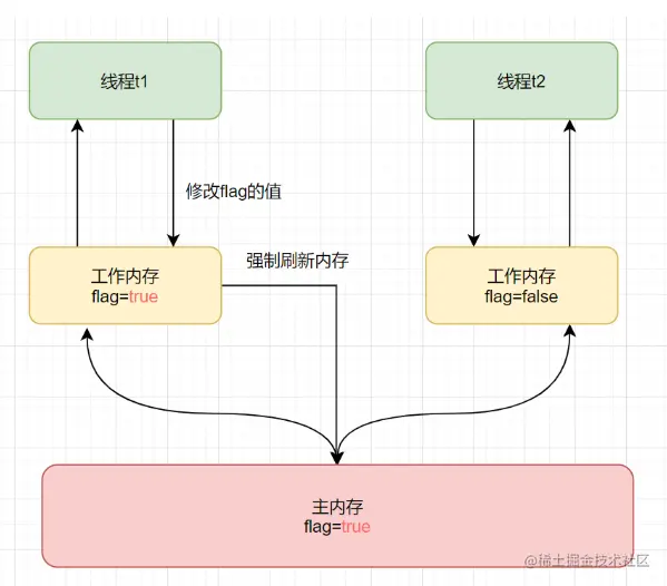如果flag变量是由volatile修饰的话,就不一样了,如果线程t1修改了flag值,volatile能保证修饰的flag变量后,可以立即同步回主内存。如图:
