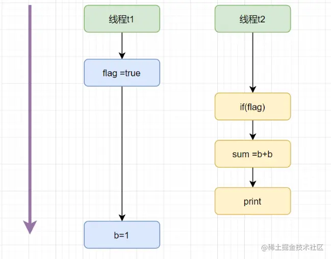 假设flag变量的初始值false,现在有两条线程t1和t2要访问它,就可以简化为以下图: