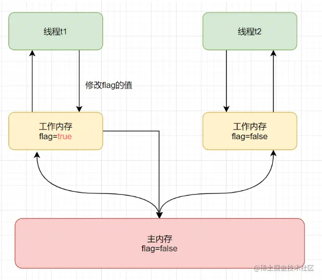 如果线程t1执行以下代码语句,并且flag没有volatile修饰的话;t1刚修改完flag的值,还没来得及刷新到主内存,t2又跑过来读取了,很容易就数据flag不一致了,如下: