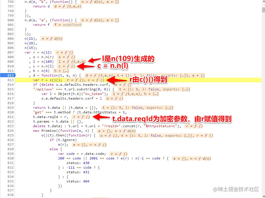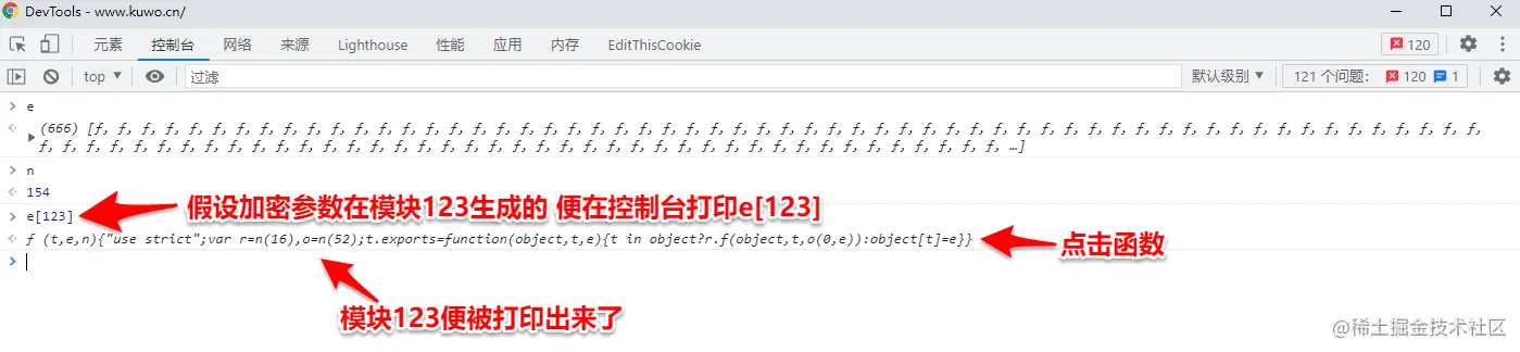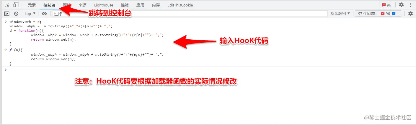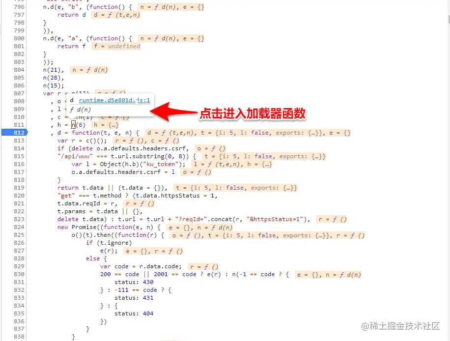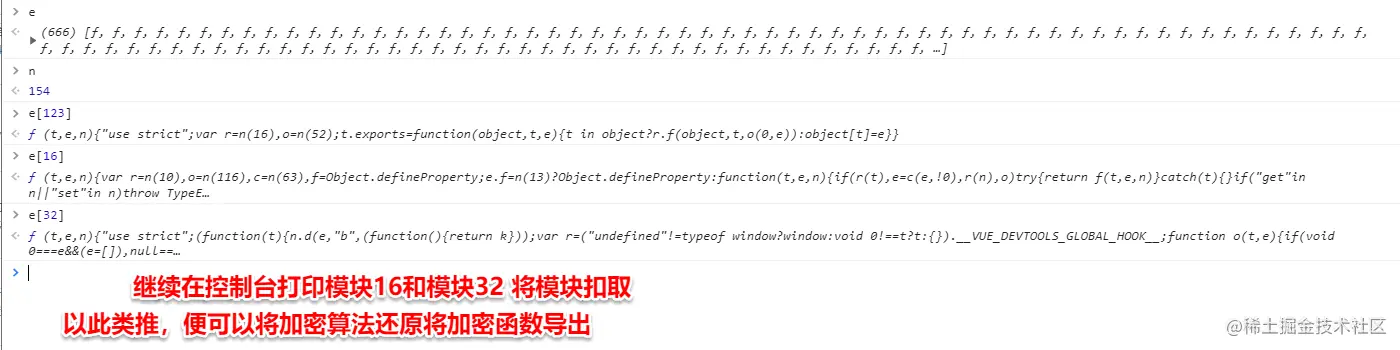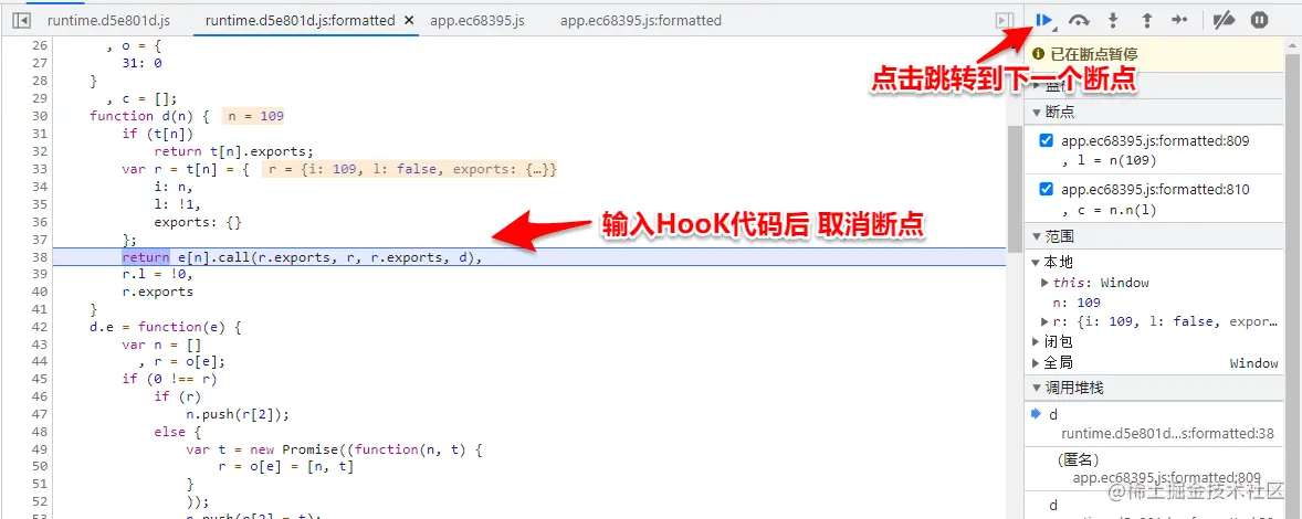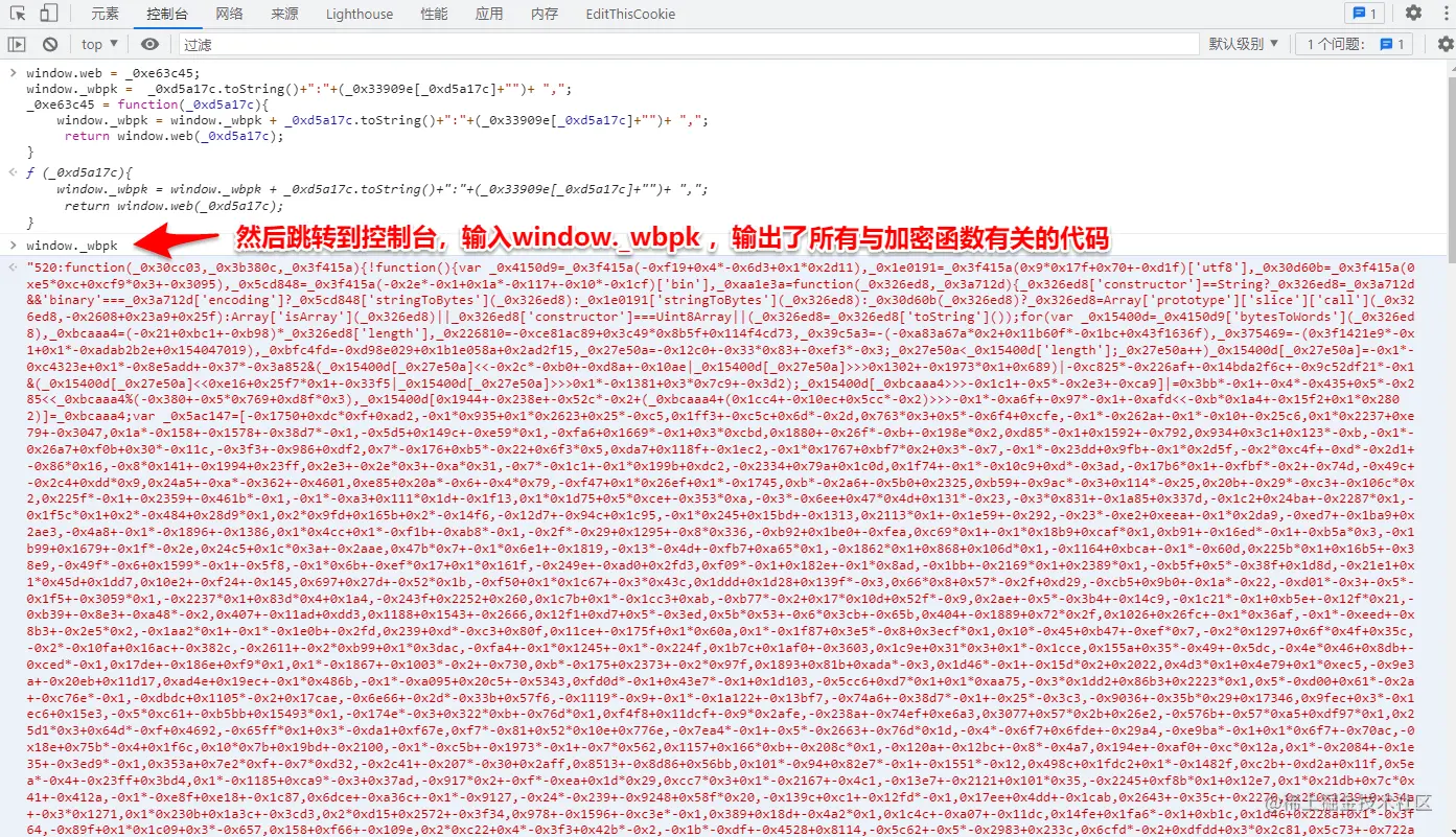 在加密函数(方法)和加密函数(方法)后打上两个断点,断点在加密函数(方法)断住后,追入到加载器函数,然后在加载器后面下断点(类似 return e[n].call(r.exports, r, r.exports, d) ),跳转到加载器后面的断点,在控制台输入HooK函数(根据不同的加载器函数改变HooK函数代码),取消加载器后面的断点,跳转到加密函数(方法)后的断点,在控制台输入window._wbpk