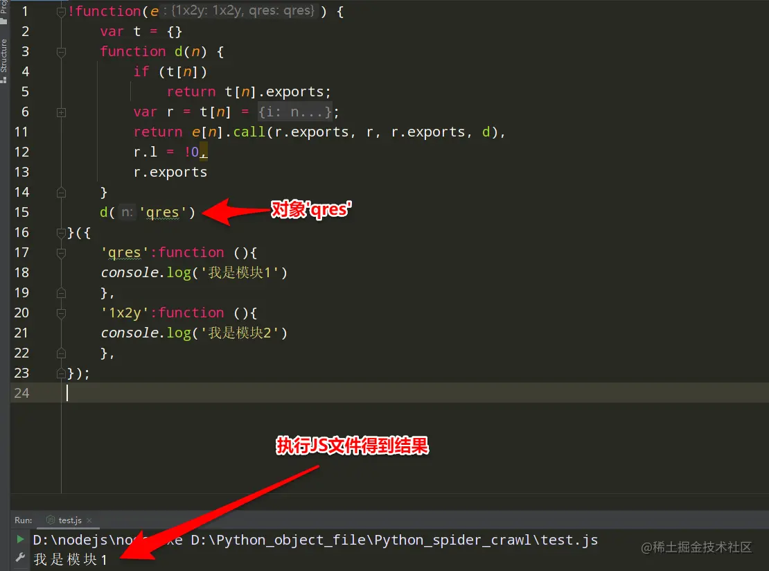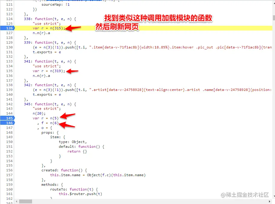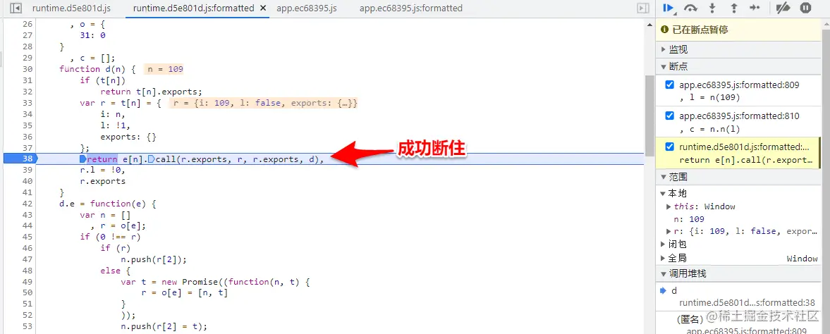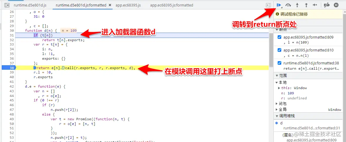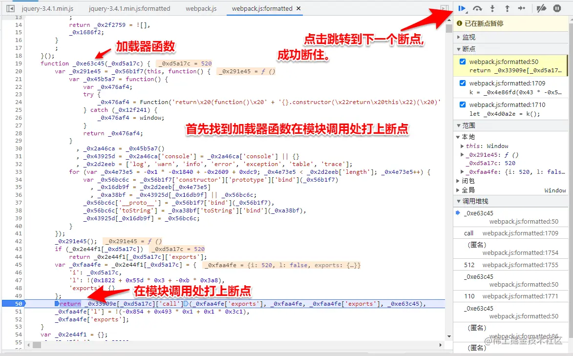3.在加载器函数中的call()方法或者apply()方法打上断点,将加密函数所在的模块和与其相关的模块一起扣取下来。