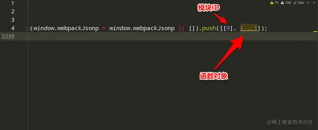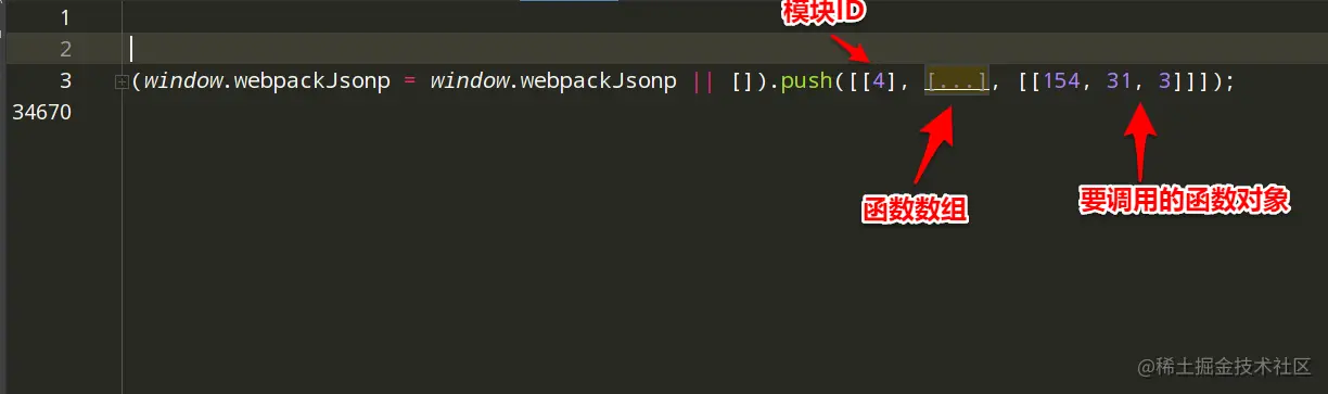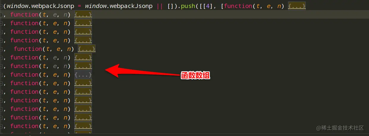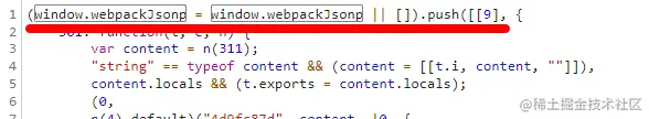如果模块比较多,就会将模块打包成JS文件, 然后定义一个全局变量 window["webpackJsonp"] = [ ],它的作用是存储需要动态导入的模块,然后重写 window["webpackJsonp"] 数组的 push( ) 方法为 webpackJsonpCallback( ),也就是说 window["webpackJsonp"].push( ) 其实执行的是 webpackJsonpCallback( ),window["webpackJsonp"].push( )接收三个参数,第一个参数是模块的ID,第二个参数是 一个数组或者对象,里面定义大量的函数,第三个参数是要调用的函数(可选)。 每个JS模块文件开头都是类似这样的开头形式: