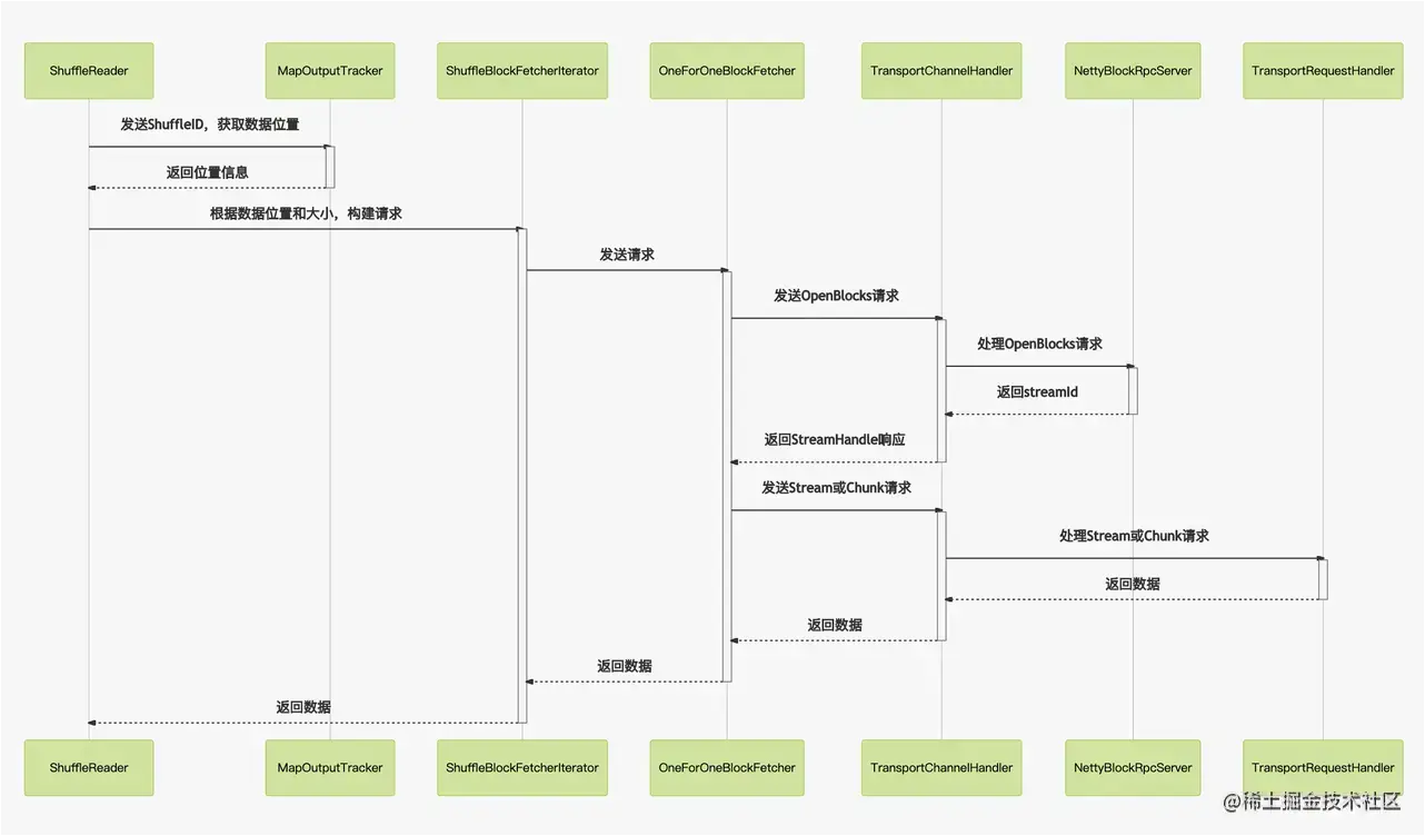 使用netty作为网络框架提供网络服务,并接受reducetask的fetch请求 首先发起openBlocks请求获得streamId,然后再处理stream或者chunk请求