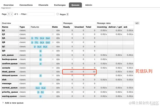 我们在这次实战中通过给消费者设置队列长度,然后将它关闭,不消费信息,消息发送后超过这个长度,超过这个长度的消息就会发送到死信队列中,由死信队列消费。