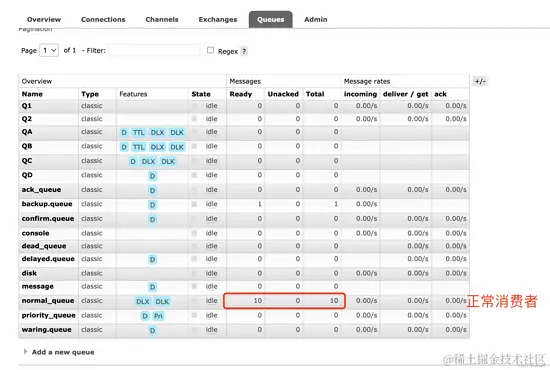 启动生产者代码 发送十条消息 此时正常队列中有十条未消费信息