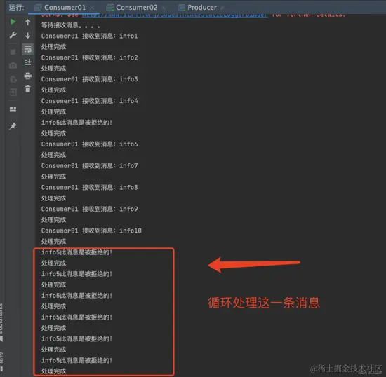 思考:如果拒绝了某一条消息,但是并没有拒绝它重新入队会导致什么?