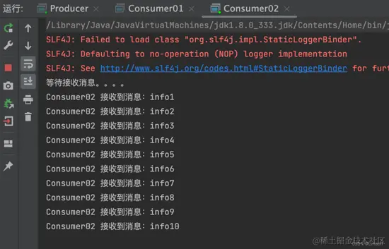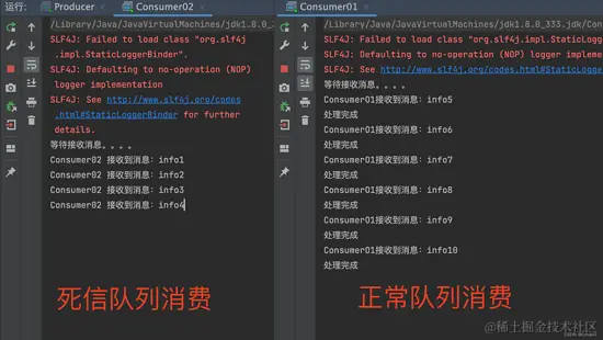 启动两个消费者 ,打开生产者(可以发现 info5 的消息自动转入死信队列中)