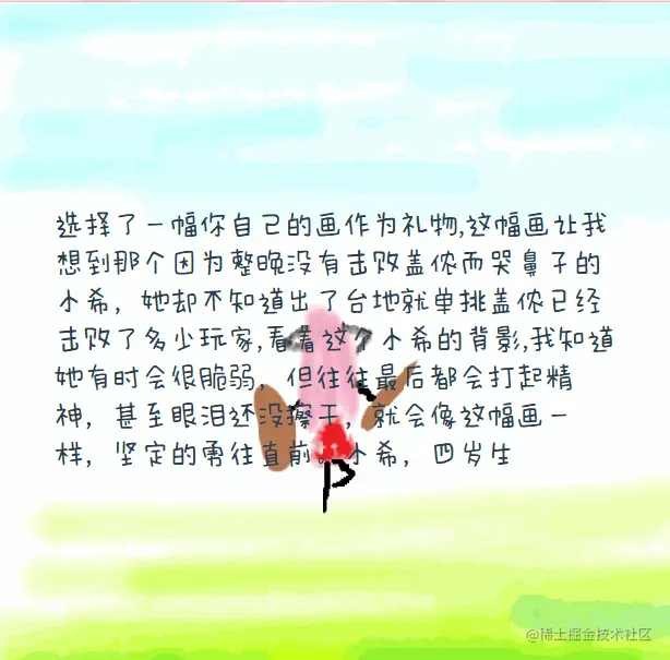 let bless = `选择了一幅你自己的画作为礼物,这幅画让我想到那个因为整晚没有击败盖侬而哭鼻子的小希,她却不知道出了台地就单挑盖侬已经击败了多少玩家,看着这个小希的背影,我知道她有时会很脆弱,但往往最后都会打起精神,甚至眼泪还没擦干,就会像这幅画一样,坚定的勇往直前。小希,四岁生日快乐!愿你一如既往,愿你心有暖阳~`