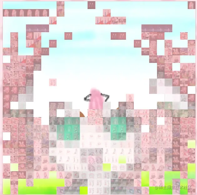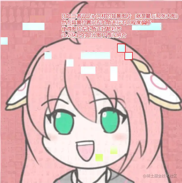 实际上就是625个小块同样将整幅图设定成了背景图片,通过更改每个小块背景图片的位置(图大块小),使得每个小块呈现大图不同部分的内容,原理如下: