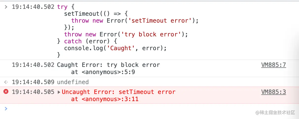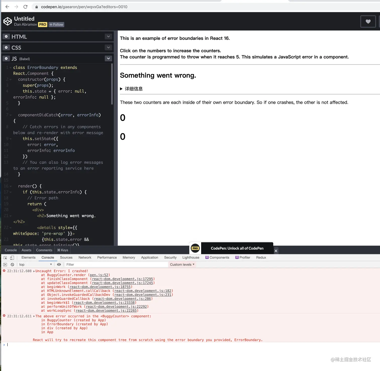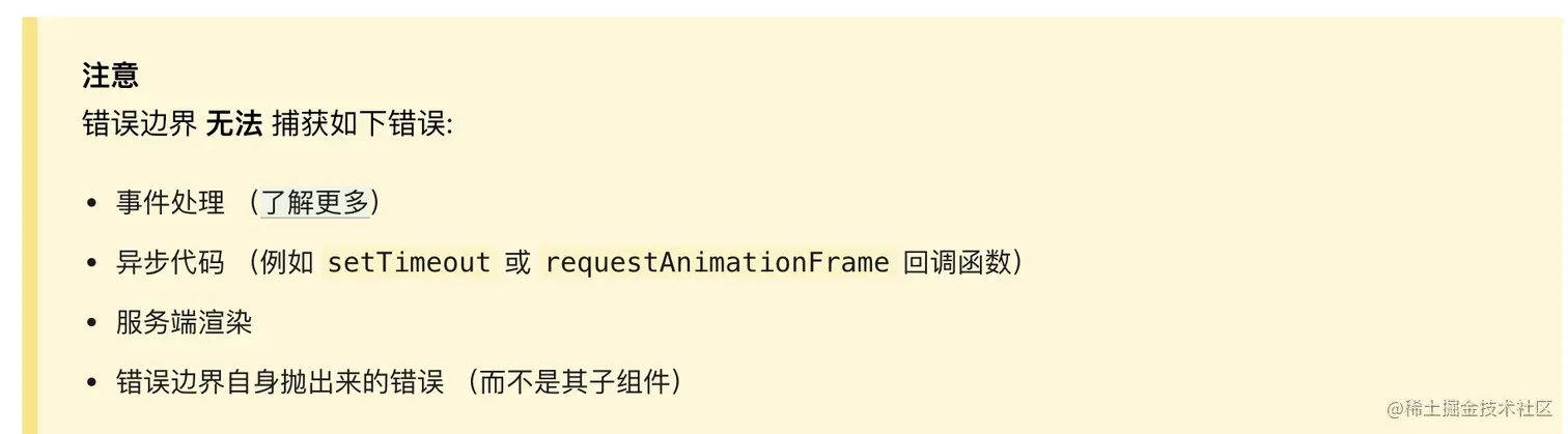 - React 错误边界,是检测,而非捕获。即使有边界,错误同样也会被抛出,参考下图官方示例: