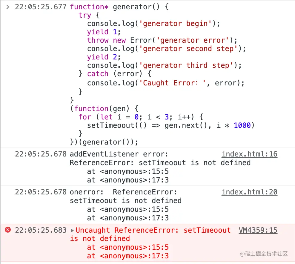 | 异步错误 | 除Promise外的其他异步错误 | window.onerrorwindow.addEvenListener('error', e => {}, true) |