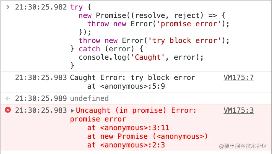 - Promise 内部有自建的错误处理机制,Promise相关的同步和异步代码错误,都走自建的错误处理。
