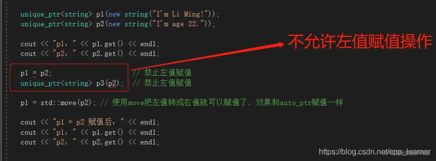 - 无法进行左值unique_ptr复制构造,也无法进行左值复制赋值操作,但允许临时右值赋值构造和赋值