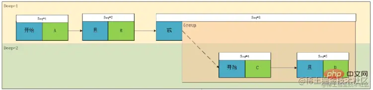 我们再看上面这个图,Deep1 的关系是Deep2中 A且B 和 C且D两个表达式计算出的结果再进行与或关系的,我们设A 且B 为 G1, C且D为 G2,于是我们发现关系节点关联的类型有两种类型,一种是条件Condition ,一种是组Group
