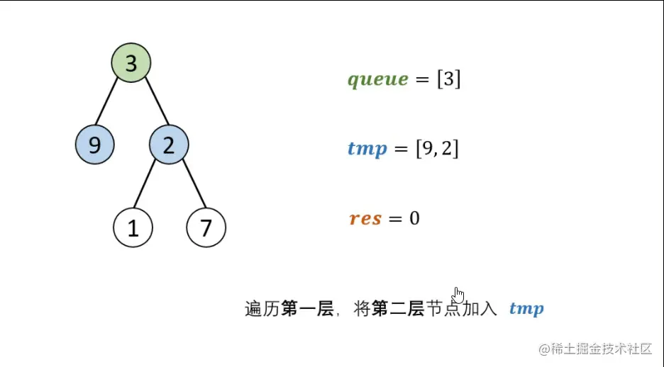 tmp,用于临时存储下一层节点; - 遍历队列: 遍历