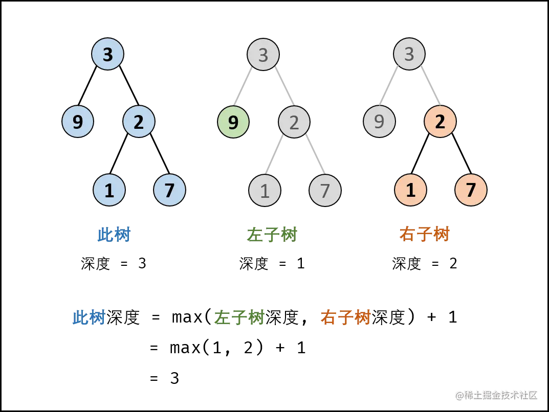 - 关键点: 此树的深度和其左(右)子树的深度之间的关系。显然,此树的深度 等于 左子树的深度 与 右子树的深度 中的 最大值 +1 。