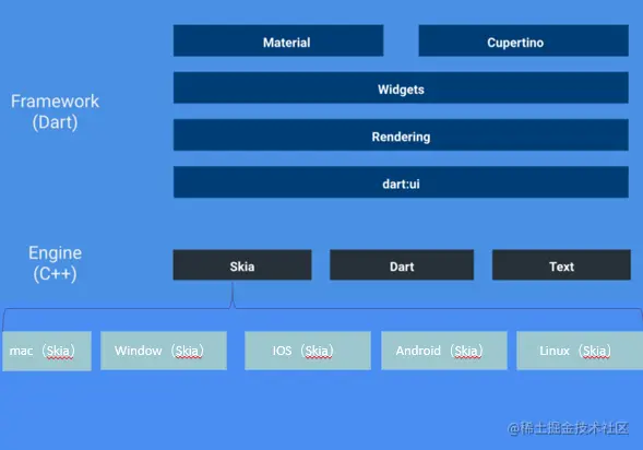 其实如果大家能站在google的角度去看懂android渲染体系的设计,那么flutter的UI体系构建在大家眼里就不在是一个什么秘密,具体Flutter3.0 框架实现原理如下图所示,跨平台的依据就是在底层的Skia库上面
