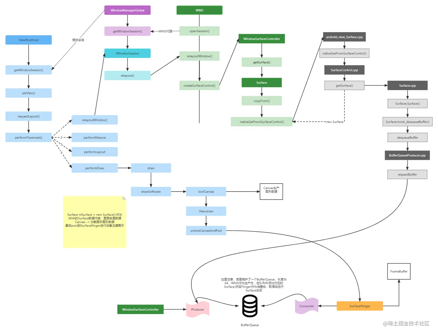 在上图中我们也能够看到在APP与surfaceflinger之间的交过过程中图像数据是采取类似生产消费模式进行沟通的,因为底层是用C的Skia图像渲染引擎,Skia能实现用户手指交互与渲染、文字排版引擎等。在安卓上,系统自带了Skia,在每个平台上都有包含Skia引擎的, 通过Skia引擎生产的相关数据, 会给如到一个固定位置,有surfaceflinger方进行消费获取,具体流程如下图所示