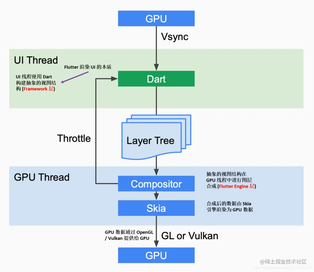 Flutter3.0 提供了一套Dart API,在底层通过OpenGL这种跨平台的绘制库,也就是下图的GPU部分(内部会调用操作系统API)实现了一套代码跨多端。由于Dart API 也是调用操作系统API,所以它的性能接近原生。虽然Dart是先调用了OpenGL,OpenGL才会调用操作系统API,但是这仍然是原生渲染,因为OpenGL只是操作系统API的一个封装库,它并不像WebView渲染那样需要JavaScript运行环境和CSS渲染器,所以不会有性能损失