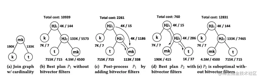 在当前的大多数系统中runtime filter所需要的算子都是在优化器的CBO阶段之后插入进物理执行计划的,使用的是一种基于规则的优化方法。然而在[3]中指出如果将runtime filter对执行计划所带来的影响在CBO阶段纳入考虑,则能更进一步地优化执行计划。如下图是一个例子: