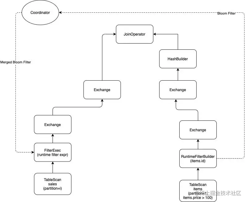 在开启了runtime filter之后的物理执行逻辑如下所示: