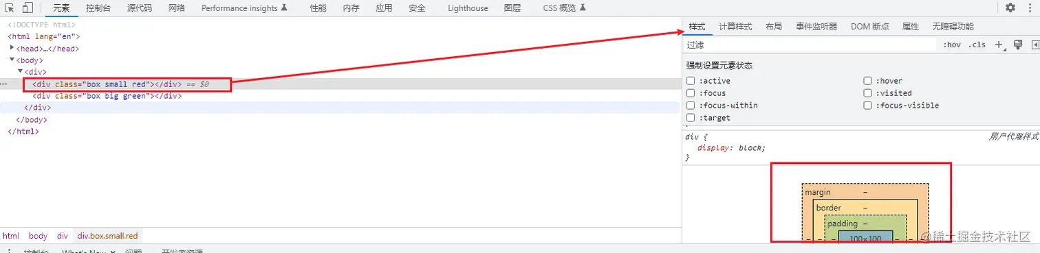 - 我们可以选中对应的元素,查看其样式和盒子模型