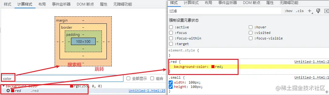 - 选中元素后,点击右侧栏计算样式(Computed)下点击样式里的箭头可以调转到
