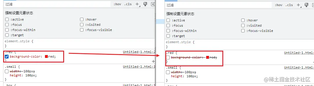或者通过右侧样式栏的 :hov ,来强制设置伪类生效: