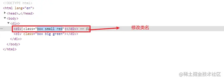 选中对应的元素,通过右侧的样式栏,可以勾选/取消类名来动态的查看类名生效效果: