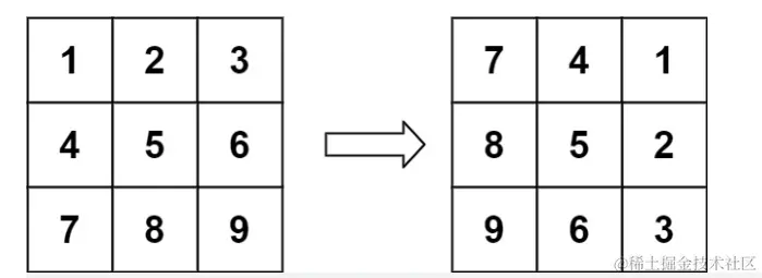 首先它是个n*n的二维数组,说明它具有对称性。我们将一个正方形旋转90度,必然是有规律可循的。