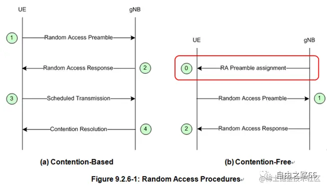 随机接入过程可以分为竞争性随机接入过程(CBRA)和非竞争性随机接入(CFRA)。非竞争性随机接入是网络将特定的随机接入资源是分配给UE的,通过Random Access Preamble网络就能识别特定的UE。