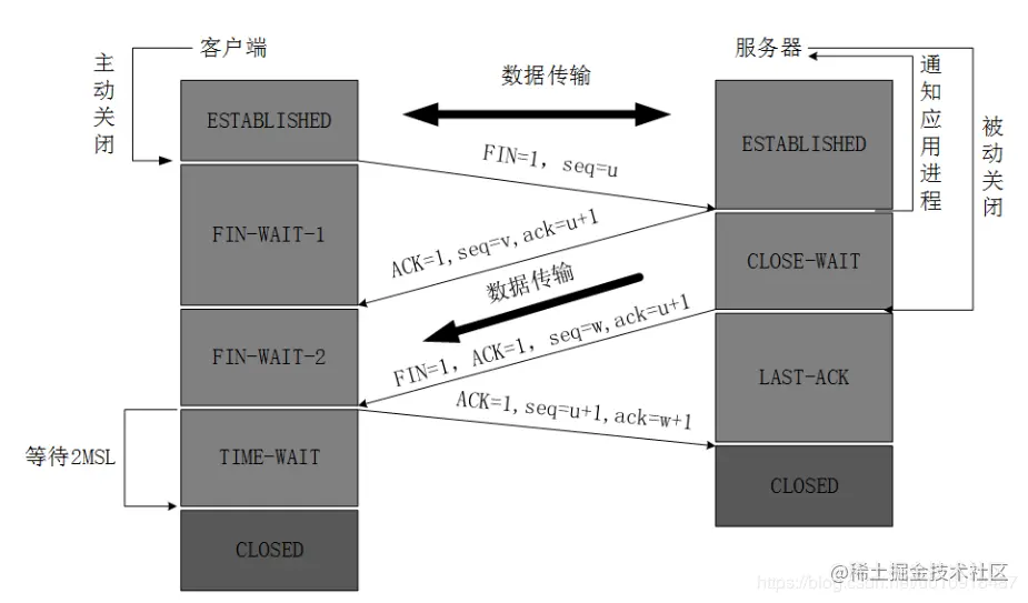 - 第四次:客户端确认服务器的断开ACK,ack=w+1,seq=u+1